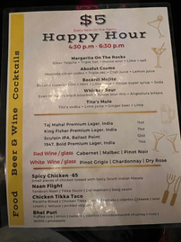 One highlight of the dining experience is the happy hour, available from 4:30 to 6:30 Tuesday through Sunday. The happy hour menu features irresistible deals like $5 chicken 65 and a delightful naan flight, making it the perfect opportunity to sample a variety of flavors at a great price.